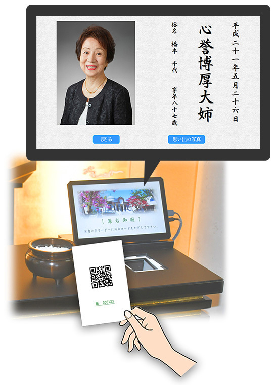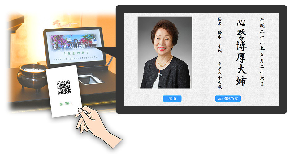 また、デジタル参拝システムにより故人の戒名や遺影、想い出の写真などをご覧いただく事も可能です。